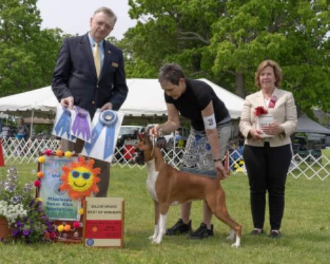 Amber is pictured above June 1, 2019, Middlesex Boxer Club Specialty Going WB/BOW for a 3pt major.