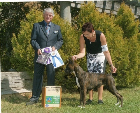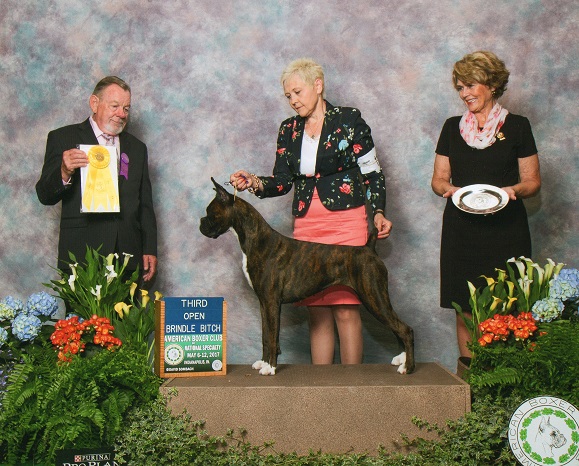 Brie is pictured placing 3rd in the open brindle bitch class at ABC 2017.