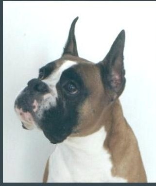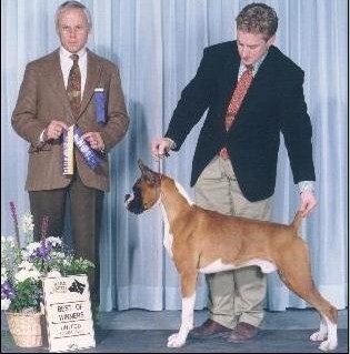 Barry Green (Lynbary boxers) was Buddy's breeder. Buddy's dam was bred by Cachet boxers and purchased by Lynbary Boxers on breeders terms with a puppy due back. Buddy was that puppy! After finishing his Canadian Championship he came to Cachet Boxers, where he was showen a few times and pointed by Len Magowitz. Then Buddy was Sold to Celsior Boxers in HI. He finished his championship in HI and was specialed there. When he retired from the show ring Buddy went to live and stand stud between Garnsey Boxers and Halcyon Boxers where he was bred to some very nice bitches and produced a number of champions. Buddy lived out his senior years with Susan Von Rothkirch (Halcyon boxers).