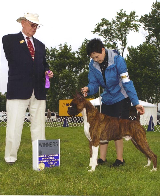 Clint became a champion at the Framingham District Kennel Club (The breeders circuit),"Rhode Island Boxer Club Specialty",Saturday 11/7/2009 , Fitchburg MA, Breeder Judge: Ms.Vera Kollar. Clint went WD/BOW for a 4pt major.