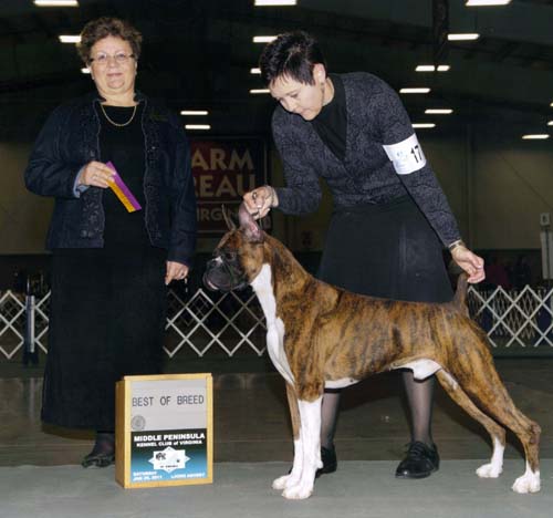 Clint is pictured above going BOB at the Middle Peninsula Kennel Club Of Virginia - Saturday 01/29/2011 under Breeder Judge: Mrs. Monika Pinsker