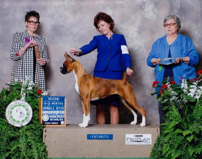 Sadie is pictured taking second 9-12 Futurity brindle bitch class at 2014 ABC . Judge: Tami Mishler. Handler: Debbie Struff