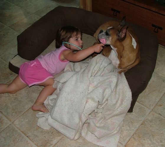Hannah & Leah Kaiser are not just sister's, but we maybe witnessing a future Dog Show Judge & Canine Cardiologist! Of course we have to mention their willing volunteer is "Ciara" Ch. Cachet's Ciara who is one month shy of her twelfth birthday!