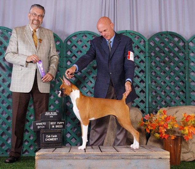 Indy is pictured first weekend out at 6 months old! Chomedey Kennel Club,Québec. 9/17/2010, WB/Best Puppy in Breed for 1pt. Judge:Rene Echevarria-Coffino. Sunday 9/19/2010, WB/Best Puppy in Breed for 2pts. Judge: James Reynolds.
