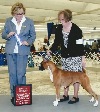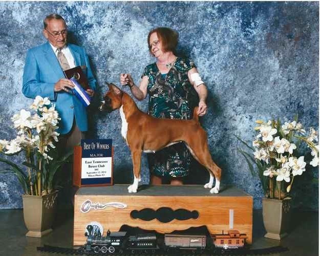 "Luna" pictured above. 9/12/14 East Tennessee Boxer Club going WB/BOW 5pt. major Judge: Mr. Lawrence Sinclair. The following day Chattanooga KC Judge: Eric Liebes Luna went WB for a 4pt. major. Handled By: Sherry Johnson.