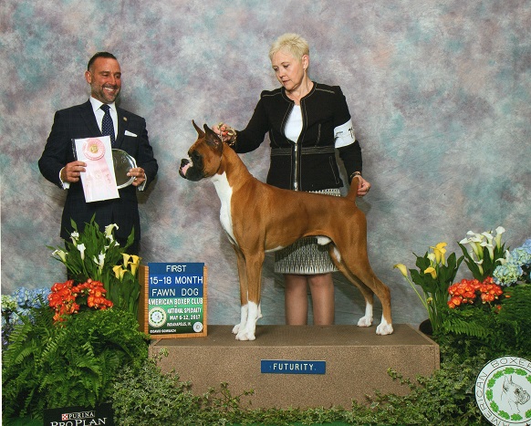 Luther is pictured below placing 1st in the 15 & under 18 month Fawn Dog Futurity class ABC 2017.Judge: Mr. Diego Garcia.