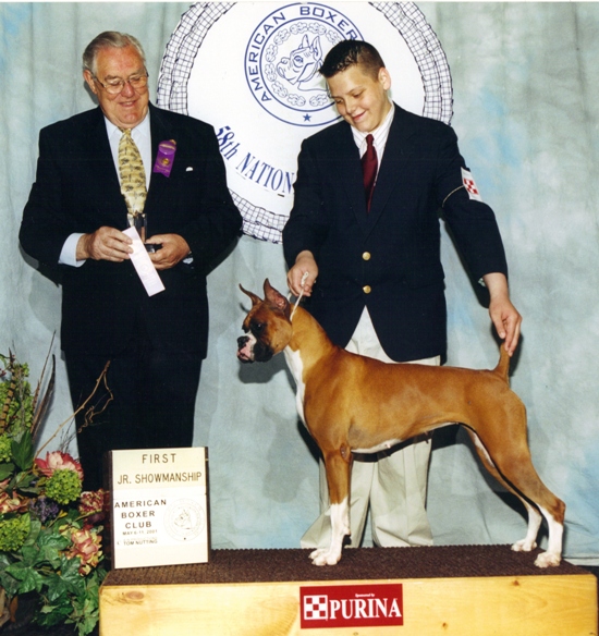 Roxanne was out of the first boxer litter I bred. She was my first Champion and my first DOM...She was also my son Derrick's first Jr's dog and the first dog he ever pointed, and she was the first DOM for Cachet Kennels....Roxanne was many first but first and foremost she was the adored couch potato to the Muchia Family. After Roxanne's show career and breeding day's were done the Muchia’s gave her an excellent home right up until her last day's...Roxanne was loved and adored by many! She was bred twice to Ch. Bee-Mike’s One Night Stand (Som) and produced 5 Champion’s 4 of which were from her first litter…In 2005 she tied for Dam producing the most champions....